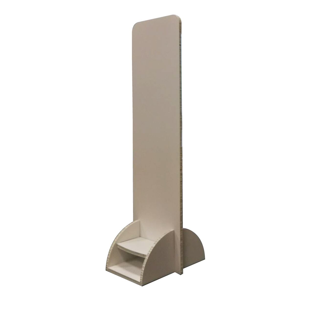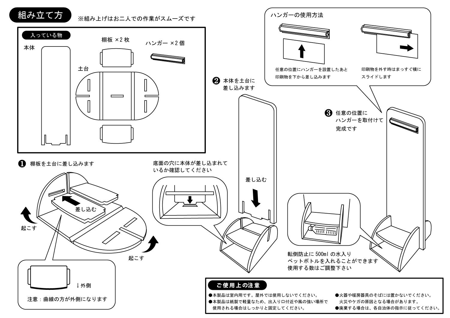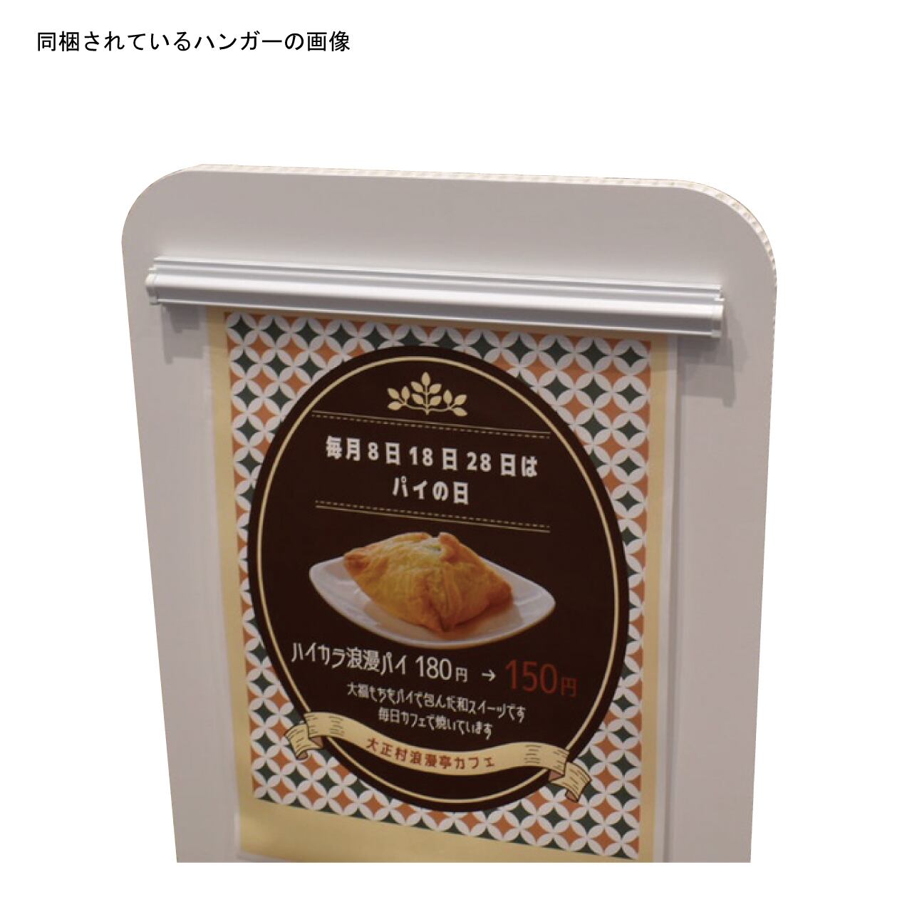 両面で告知できるハニカム素材の真っ白な告知ボードです。素材の厚みは16㎜あり、強度抜群。チラシを差し込める万能ハンガーが2本ついているので、任意で貼り付けてください。本体下には棚がありますので、小物なども置くことができます。