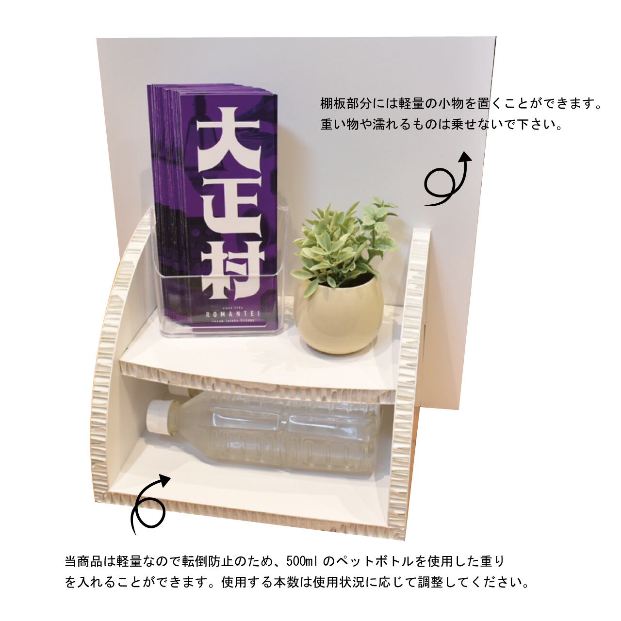 紙製なので、屋内仕様となります。また、本製品は軽量な為、風通りのある場所に設置される場合には、水をいれたペットボトル(四角い500ml推奨)等を最下段のスペースへ入れてください。(奥まで入れれば重りが見えづらくなります)。