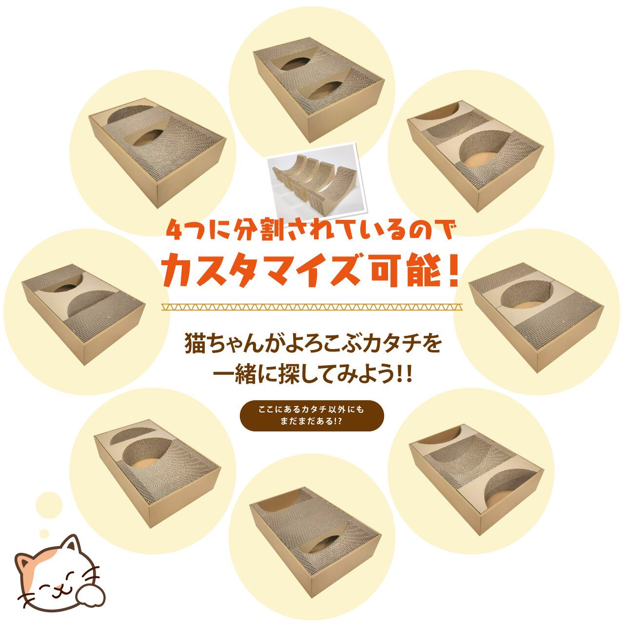 ・4分割になっているから、色んな「カタチ」にカスタマイズ可能!つめとぎ、遊具、やすらぎの場など、ねこちゃんがよろこぶ「カタチ」を一緒に探してみてね。